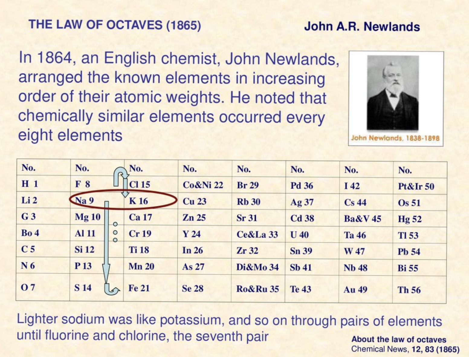 p2,3 sevens From Britannica: “law of octaves, in chemistry, the generalization made by the English chemist J.A.R. Newlands in 1865 that, if the chemical elements are arranged according to increasing atomic weight, those with similar physical and chemical properties occur after each interval of seven elements. Newlands was one of the first to detect a periodic pattern in the properties of the elements and anticipated later developments of the periodic law.”