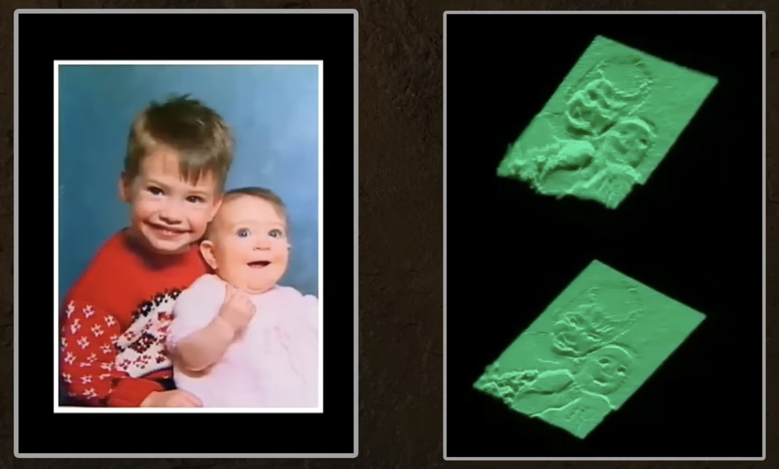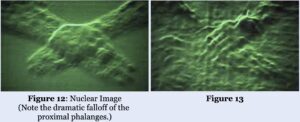 One of the most striking similarities is demonstrated in Figures 12 and 13. “Ninth, isometric projection (V-P-8) of our generated images, yielded a striking similarity to the VP-8 image of the Shroud at the fall off of the left fingers. Knowing this is due to a 75-80% drop in signal intensity on our image, its relevance to the same phenomenon on the Shroud should not be overlooked and seriously considered to be a function of a similar effect i.e. a dosimetric sudden fall off of signal or radiation.”